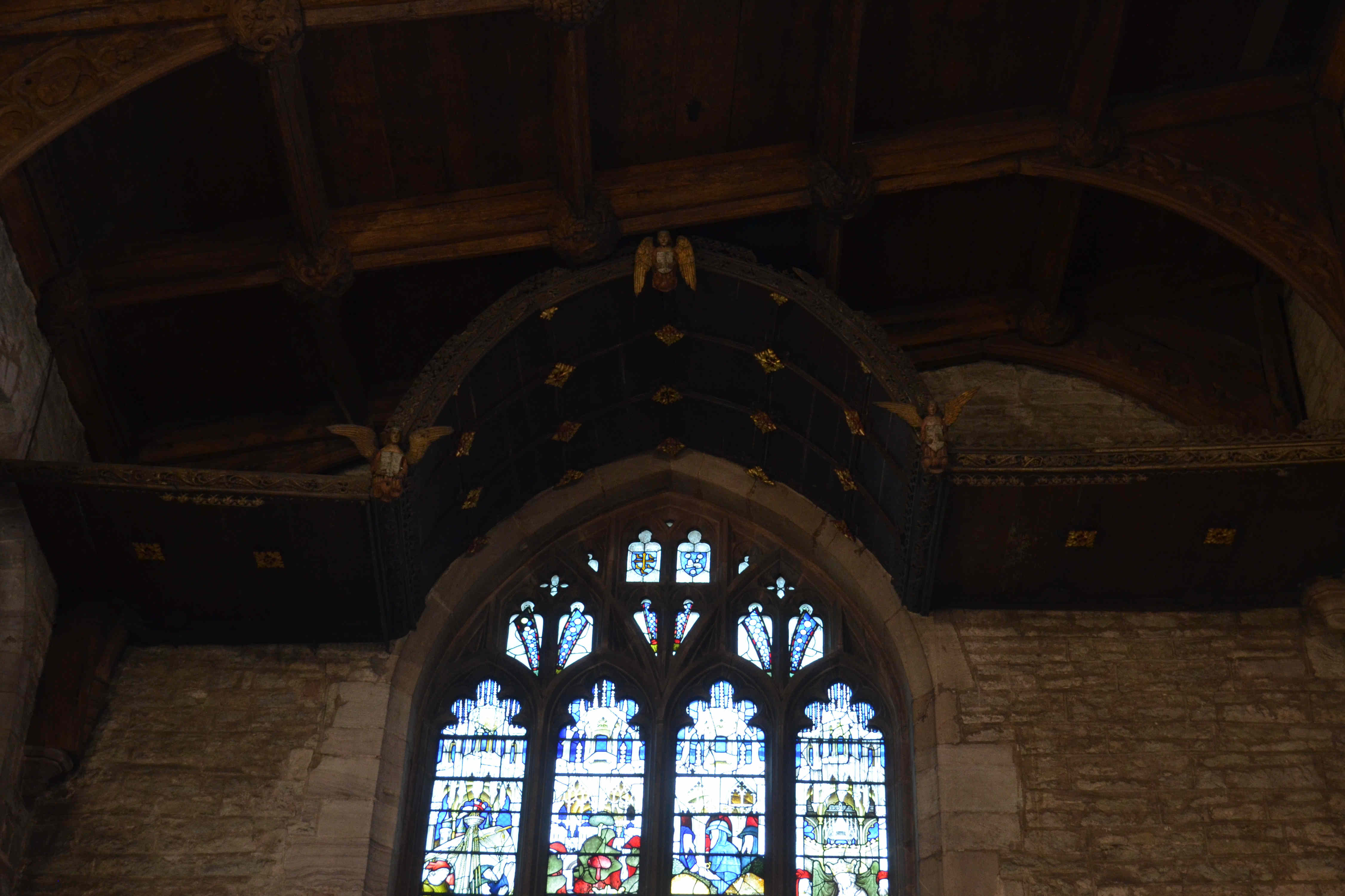 Uniquely, the canopy extends beyond the width of the altar with two flat side-pieces on either side of its central vault to supporting corbels on the north and south walls of the chapel. The underside is panelled with oak wainscot boards decorated with bosses. Three shield-bearing angels are positioned, one at the apex and the other two at the feet of its arch round the window. A vine trail runs along the eastern face with somewhat damaged open-work cresting above and below. In addition, and not immediately visible from outside the sanctuary, the north and south returns from the bottom face of the vault to the east window have beautifully carved pomegranate trails a design that was later repeated along the top of the linenfold panelling on the north wall. Both these returns have elaborate top cresting consisting of intertwined trails that support alternately bunches of grapes and flowering trefoils. Drop cresting below completes the decorative carving.